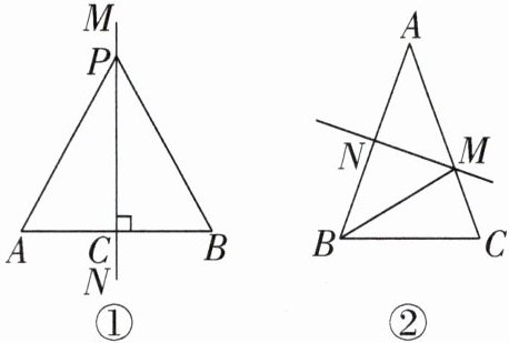 (2)定理应用:如图②,在$△ABC$中,$AB= AC$,AB的垂直平分线交AB于点N,交AC于点M,连接MB,若$AB= 10cm,△MBC$的周长是18cm.