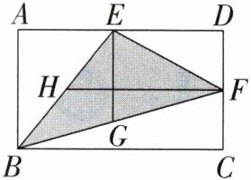 (2) 5EG = 3FH. 解析: 本题可尝试用“等面积”法(若两个三角形的高(或底)相同, 则它们的面积比等于对应底边(或高)的比)求出在点 E 运动过程中 EG 和 FH 的数量关系. 长方形 ABCD 中有 AD⊥CD, AB//CD, AD//BC, 因为 EG//AB, FH//BC, 所以 EG⊥HF, AD⊥EG, CD⊥HF, 所以 DE, AE 分别等于 △EGF, △EGB 的 EG 边上的高, DF, CF 分别等于 △EHF, △BHF 的 FH 边上的高, 所以 $S_{△BEF}=\frac{1}{2}EG\cdot DE+\frac{1}{2}EG\cdot AE=\frac{1}{2}HF\cdot DF+\frac{1}{2}HF\cdot CF$, 所以 $\frac{1}{2}EG\cdot(DE + AE)=\frac{1}{2}HF\cdot(DF + CF)$, 即 EG·AD = HF·CD. 因为 AD = 10 cm, DC = 6 cm, 所以 10EG = 6HF, 即 5EG = 3FH.