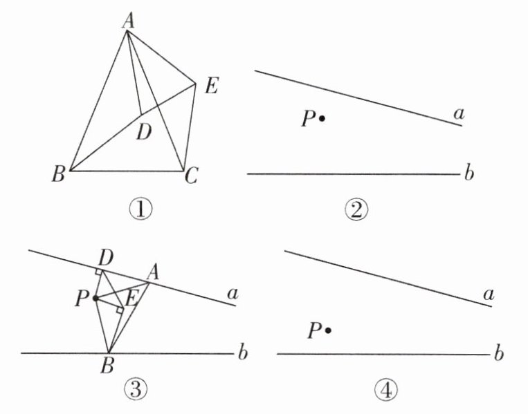 如图②,已知直线 a,b 及点 P,a 与 b 不平行.作等腰直角三角形 PAB,使得点 A,B 分别在直线 a,b 上.小明同学作法简述如下:如图③,过点 P 作$PD⊥a$,垂足为点 D,以 P 为直角顶点作等腰直角三角形 PDE,过点 E 作$EB⊥PE$,交 b 于点 B,在 a 上截取$DA= BE$,连接 AB.$△PAB$即为所要求作的等腰直角三角形.