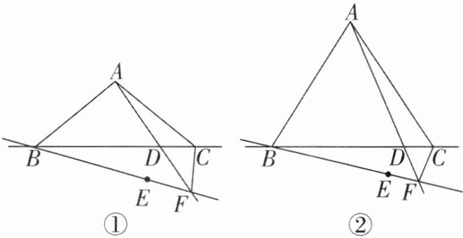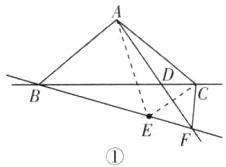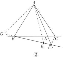 ①如图②,当点 D 在线段 BC 上时,用等式表示线段 AF,BF,CF 之间的数量关系,并证明;