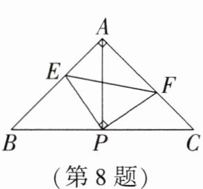 8. (2025·无锡期中)如图,在△ABC中,AB= AC,∠BAC= 90°,直角∠EPF的顶点P是BC中点,PE,PF分别交边AB,AC于点E,F.给出以下四个结论:①AE= CF;②△EPF是等腰直角三角形;③S四边形AEPF= $\frac{1}{2}$S△ABC;④EF>AP.当∠EPF在△ABC内绕顶点P旋转时(点E不与A,B重合),上述结论中始终正确的有 ()