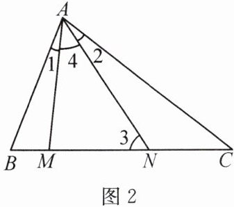 (2)如图2,∠1 = ∠2,∠3 = ∠4,∠B = ∠BAC,求∠BAN的大小.