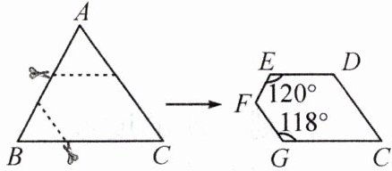 9. (2025·恩施)如图,将三角形纸片$ABC沿虚线剪掉两角得五边形CDEFG$,若$DE// CG$,$FG// CD$,根据所标数据,则$\angle A$的度数为(