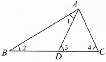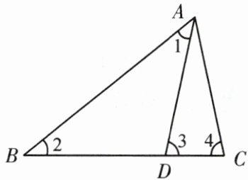 【典例2】如图,$\triangle ABC$中,$D是BC$上一点,$\angle 1= \angle 2$,$\angle 3= \angle 4$,$\angle BAC= 63^{\circ}$,求$\angle DAC$的度数。