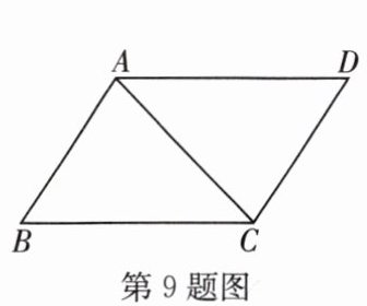 9.如图,已知$\triangle ABC\cong \triangle CDA$,则下列结论:①$AB = CD$,$BC = DA$;②$\angle BAC = \angle DCA$,$\angle ACB = \angle CAD$;③$AB// CD$,$BC// DA$.其中正确的有(