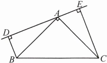 【典例2】如图,在$△ABC$中,$AB= AC$,$AB⊥AC$,过A作直线l,$BD⊥l$于D,$CE⊥l$于E,求证:$DE= BD+CE$。