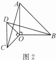 变式2.将两块含$45^{\circ}角的大小不同的直角三角板△COD和△AOB$,如图1、2摆放。连接$AC$,$BD$,问$AC与BD$存在怎样数量关系与位置关系。