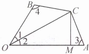 【典例】如图,在四边形OACB中,$CM\perp OA$于M,$\angle 1= \angle 2,\angle 3+\angle 4= 180^{\circ}$,求证: