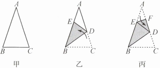 【典例 2】(2025·武汉)已知一张三角形纸片 ABC(如图甲),其中$AB= AC$.将纸片沿过点 B 的直线折叠,使点 C 落到 AB 边上的 E 点处,折痕为 BD(如图乙).再将纸片沿过点 E 的直线折叠,使点 A 恰好与点 D 重合,折痕为 EF(如图丙).原三角形纸片 ABC 中,$∠A$的大小为(