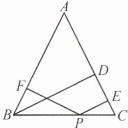 【典例3】如图,在$\triangle ABC$中,$AB= AC$,$AC边上的高BD= 4$,$P为BC$上一点,$PE⊥AC于E$,$PF⊥AB于F$,求$PE+PF$的值.