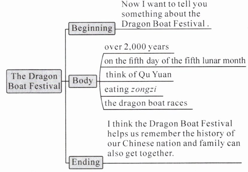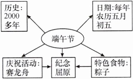 4.写作要点:①端午节的时间和历史;②人们的庆祝活动;③这个节日的意义