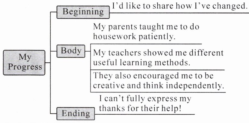4.写作要点:①父母和老师给了我什么帮助;②我取得了哪些进步