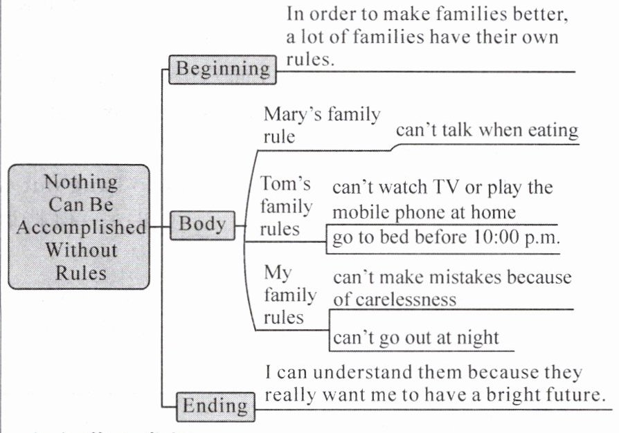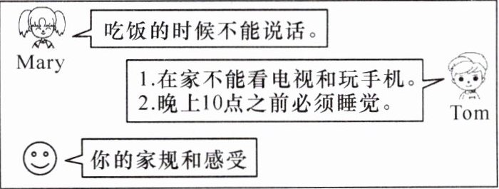 俗话说:“无规矩不成方圆”。为了营造良好的家庭氛围,使子女养成良好的生活习惯,每个家庭都会有这样或那样的家规。请根据以下内容提示,先简要介绍Mary和Tom的家规,然后说说你家的家规(2-3条)并谈谈自己的感受。