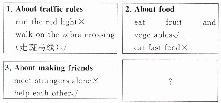 First of all, it's necessary for us to realize the importance of traffic safety. I always keep traffic rules in mind that red light means "stop" and green light means "go". As for food safety, I have developed good eating habits. For example, I prefer to eat more healthy food like fresh fruit and vegetables. Meanwhile, I keep fast food away from my life. Besides, I never meet strangers alone, especially friends who I make on the Internet. There is a saying that "A friend in need is a friend indeed." True friends are always there to help each other.