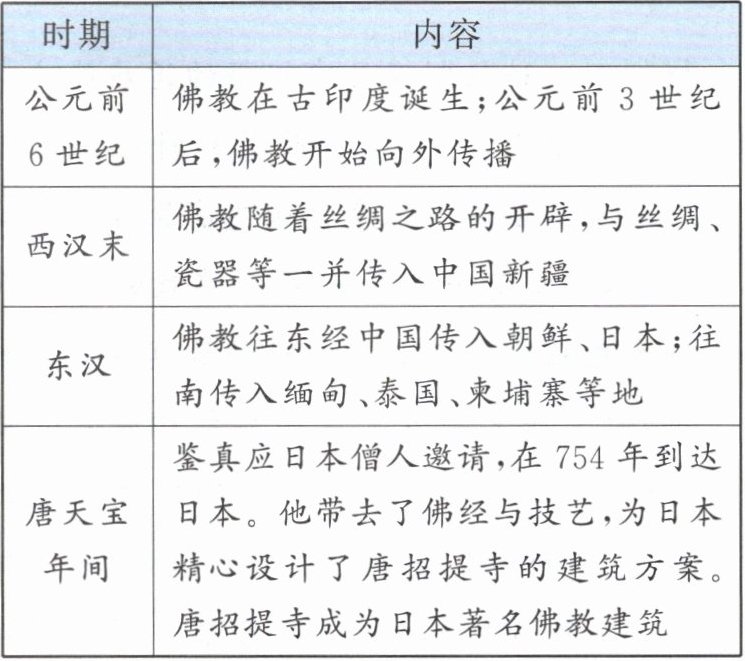 论述:佛教是诞生在古印度的宗教,后传入中国、朝鲜、日本及东南亚等地,适应了这些地区的社会发展。佛教在传播地扎根,与当地文化结合,诞生了新的文明成果,如中国的白马寺、龙门石窟、云冈石窟、大足石刻,日本的唐招提寺等。佛教在世界各地拥有众多信徒,深刻影响着他们的生活;与佛教有关的建筑、雕刻也为人类留下了宝贵的财富。(4分)