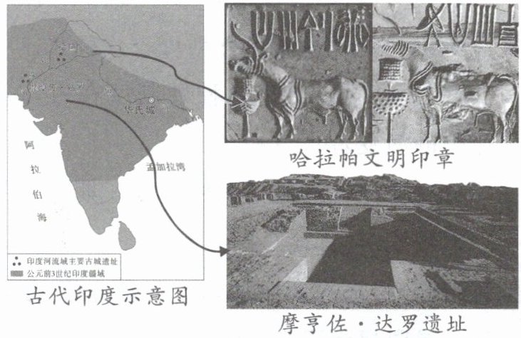 (2)答:哈拉帕文明印章与摩亨佐·达罗遗址的发现和发掘证明古印度文明存在,这是研究古印度文明的可信史料;它们的存在证明古印度人曾创造了光辉灿烂的文明,对人类历史发展作出了重要贡献;它们的存在揭示了古印度人掌握了农耕、畜牧养殖、冶金等技术;它们的存在还证明古印度人对城市规划和治理已经达到一定水平,文明程度较高。(任答三点3分,其他合理答案亦可)