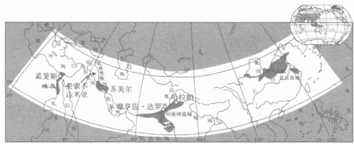(1)观察上图并结合所学知识回答,古代印度文明所属类型以及形成该文明的有利条件。(4分)