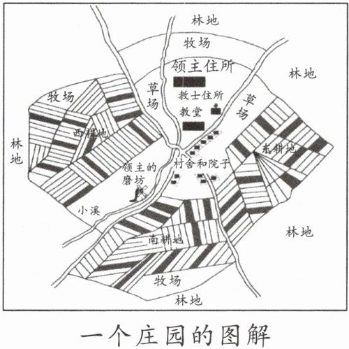 (1)根据图片并结合所学知识,判断以下表述的正误。你认为正确的,请在对应题号后画“√”;认为不正确的,请在对应题号后画“×”。(2 分) A.耕地、牧场、草场和林地是西欧庄园土地的重要构成部分。 ( ) B.庄园领主和庄园居民共同享有庄园的一切。( ) (2)据图指出西欧庄园的特点。(1 分) 答:_____ (3)综上并结合所学知识,谈谈你对“西欧庄园俨然是一个独立王国”这句话的理解。(3 分) 答:_____