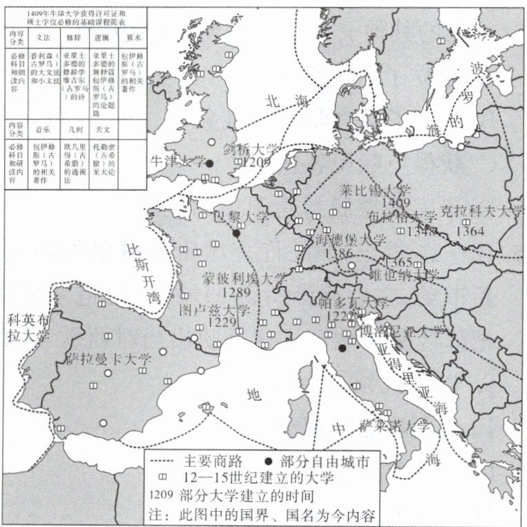 (1)根据材料一并结合所学知识,指出欧洲大学基础课程内容的特点,并分析欧洲大学分布的特点。(4分)答:内容特点:来源于希腊罗马古典文化。(2分)分布特点:广泛分布在西欧;集中分布在城市及附近地区。(两点2分)材料二 城市特许状是由国王或大封建主颁发给城市和市民的一种法律意义上的权利认可证书。它的出现是中世纪西欧封建经济发展和社会历史发展的必然结果。……法国洛里斯城的特许状规定:任何人只要在城里平安生活一年零一天,便可获得自由……1175年,特尔瓦伯爵亨利给“塞纳河大桥附近新建的市镇”颁发的特许状明确规定:手艺工匠和商人每年交纳一笔定额地租,即有权在市内居住和包租郊区农田,亦有权自由出售房屋、葡萄和租地。有些特许状还授予市民选举市长、城市治安官、法官、顾问等权利。城市特许状促进了中世纪西欧新兴城市的诞生(尤其是自治城市的出现),而且促进了中世纪西欧城市商品经济的发展。——摘编自冯正好《中世纪西欧的城市特许状》(2)根据材料二,归纳西欧市民享有的主要权利。(3分)答:人身自由;财产权;(政治)自治权和参与行政管理。(三点3分)(3)综合以上材料并结合所学知识,试着解释12—15世纪欧洲政治、经济、文化发展之间的关系。(2分)答:中世纪西欧城市的自由与自治是封建经济发展的必然结果;自由、自治权(特许状)的取得推动城市经济和大学教育的发展;大学的发展反映了经济和社会发展的要求。(任答两点2分)