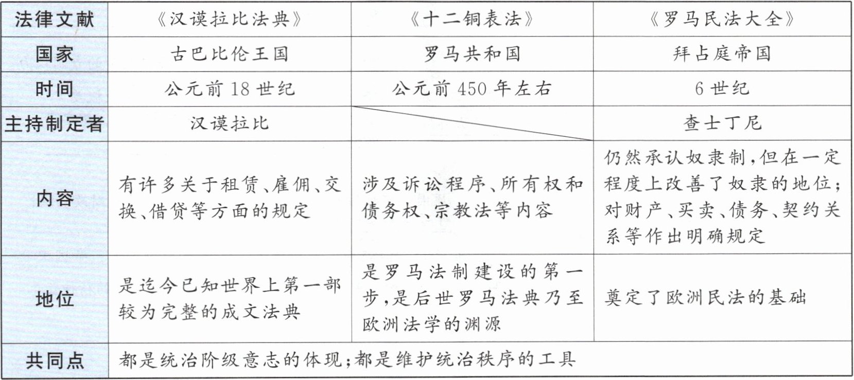 古巴比伦王国 罗马共和国 拜占庭帝国 公元前18世纪 公元前450年左右 6世纪 汉谟拉比 查士丁尼 有许多关于租赁、雇佣、交换、借贷等方面的规定 涉及诉讼程序、所有权和债务权、宗教法等内容 仍然承认奴隶制,但在一定程度上改善了奴隶的地位;对财产、买卖、债务、契约关系等作出明确规定 是迄今已知世界上第一部较为完整的成文法典 是罗马法制建设的第一步,是后世罗马法典乃至欧洲法学的渊源 奠定了欧洲民法的基础 都是统治阶级意志的体现;都是维护统治秩序的工具