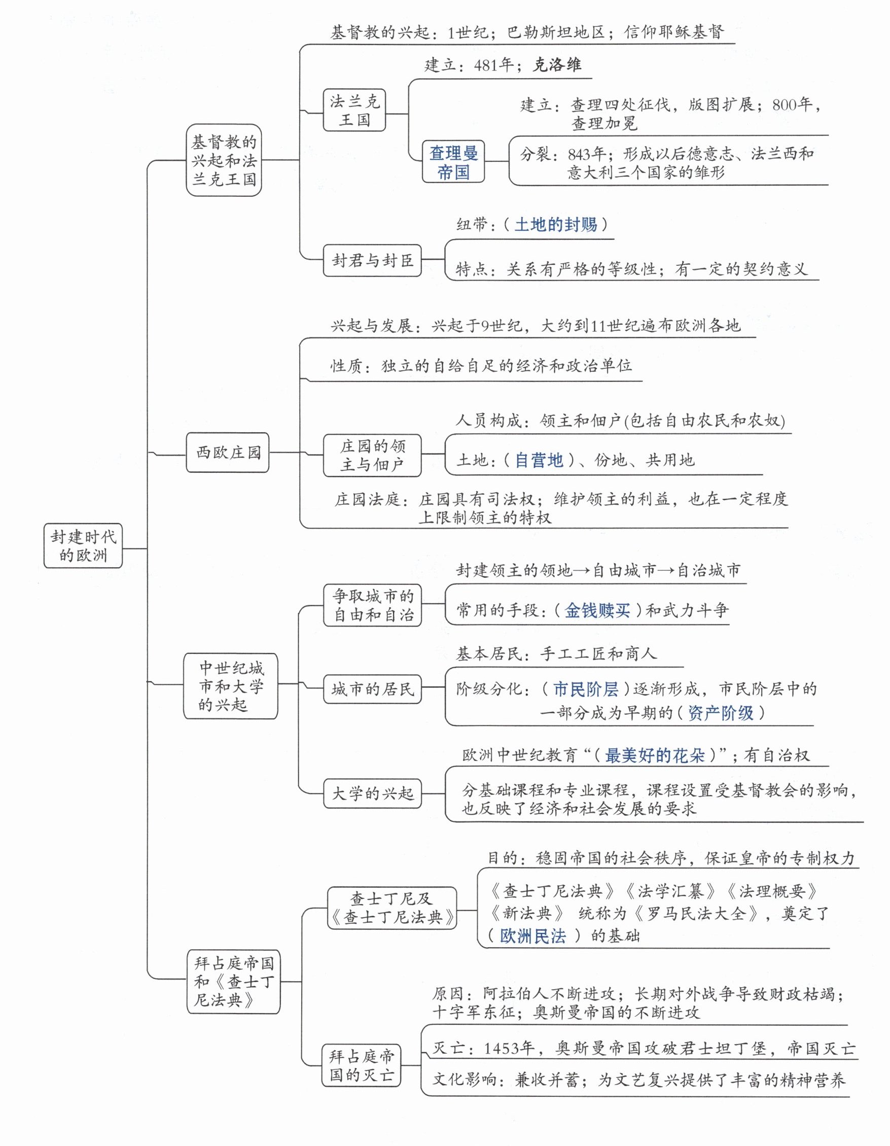 1世纪;巴勒斯坦地区;信仰耶稣基督 481年;克洛维 查理四处征伐,版图扩展;800年,查理加冕 843年;形成以后德意志、法兰西和意大利三个国家的雏形 (土地的封赐) 关系有严格的等级性;有一定的契约意义 兴起于9世纪,大约到11世纪遍布欧洲各地 独立的自给自足的经济和政治单位 领主和佃户(包括自由农民和农奴) (自营地)、份地、共用地 庄园具有司法权;维护领主的利益,也在一定程度上限制领主的特权 (金钱赎买)和武力斗争 手工工匠和商人 (市民阶层)逐渐形成,市民阶层中的一部分成为早期的(资产阶级) (最美好的花朵) 稳固帝国的社会秩序,保证皇帝的专制权力 (欧洲民法) 阿拉伯人不断进攻;长期对外战争导致财政枯竭;十字军东征;奥斯曼帝国的不断进攻 1453年,奥斯曼帝国攻破君士坦丁堡,帝国灭亡 兼收并蓄;为文艺复兴提供了丰富的精神营养