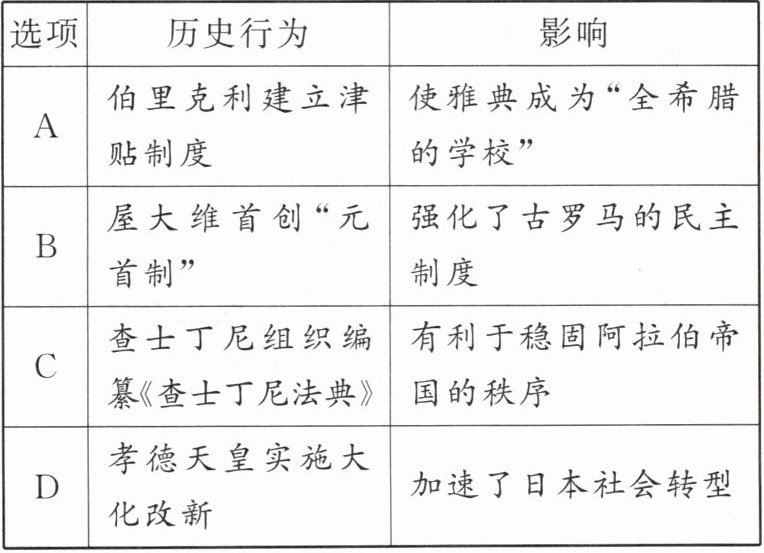 8. 历史事件往往会产生历史影响。下表中的历史行为与其影响对应关系正确的一组是(