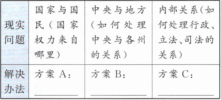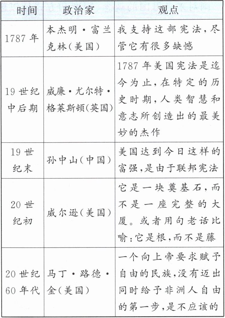 10.(9分)阅读下列材料,完成探究。【现实困境】材料一 美国独立后,中央权力极小,没有权力管理州际贸易和对外贸易,无权干涉各州内部事务,各州各自为政,币制不统一,市场不统一。这些情况使美国的有识之士感到忧虑,他们认识到,只有通过制定新宪法,加强中央权力,才能使这个新生国家免于夭折。——摘编自吴于廑、齐世荣主编《世界史·近代史编》(1)美国制定新宪法的必要性是什么?(2分)答:独立之初的美国中央权力小,各州各自为政;币制、市场等不统一,制约经济发展。(两点2分)【突出重围】独立后的美国面临中央与地方如何分权的问题。为解决这些问题,美国统治者进行了艰难探索。现实问题国家与国民(国家权力来自哪里)中央与地方(如何处理中央与各州的关系)内部关系(如何处理行政、立法、司法的关系)解决办法方案A:方案B:方案C:(2)请填写合理方案。(3分)答:A:主权在民(权力来自人民,国家的权力是人民赋予的)。B:中央权力大于地方(地方让渡一部分权力给中央,保证中央政令畅通)。C:三权分立,相互制约(行政、司法、立法相互独立)。(三点3分)【后世影响】时间政治家观点1787年本杰明·富兰克林(美国)我支持这部宪法,尽管它有很多缺憾19世纪中后期威廉·尤尔特·格莱斯顿(英国)1787年美国宪法是迄今为止,在特定的历史时期,人类智慧和意志所创造出的最美妙的杰作19世纪末孙中山(中国)美国达到今日这样的富强,是由于联邦宪法20世纪初威尔逊(美国)它是一块奠基石,而不是一座完整的大厦。或者用句老话比喻:它是根,而不是藤20世纪60年代马丁·路德·金(美国)一个向上帝要求赋予自由的民族,没有迈出同时给予非洲人自由的第一步,是不应该的(3)请从以上政治家的观点中任选一个,运用所学知识进行论述。(要求:史论结合,条理清楚)(4分)答:示例:观点:孙中山:“美国达到今日这样的富强,是由于联邦宪法。”论述:美国独立后,各州各行其是,矛盾重重,代表国家的中央政府软弱无力。1787年宪法的颁布,从法律上结束了美国邦联制,使美国从邦联国家过渡到联邦制国家,巩固了国家统一,增强了中央政府的权力。1787年宪法是世界上第一部资产阶级成文宪法,奠定了美国政治制度的法律基础。(3分)结论:1787年美国宪法巩固了国家的统一,促进了美国资本主义的发展,使国家日益强大。(1分)