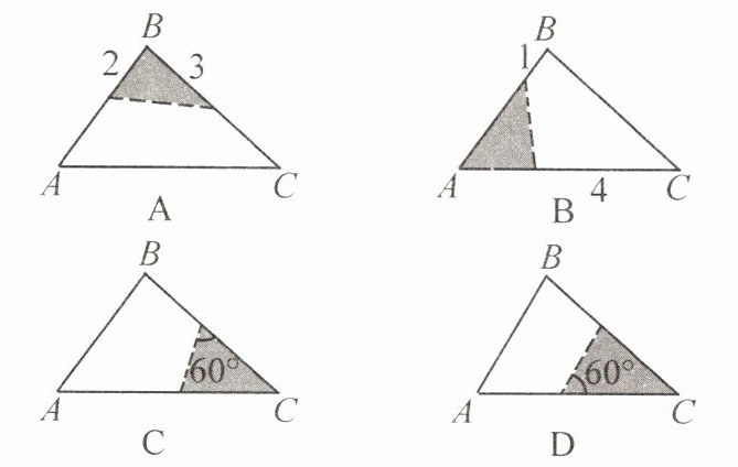 6. (2025·编写) 如图,在$\triangle ABC$中,$∠A= 60^{\circ }$,$AB= 4$,$AC= 6$,将$\triangle ABC$沿图示中的虚线剪开,剪下的三角形与$\triangle ABC$不相似的是 ()