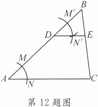 12. (2025·金牛)如图,在$\triangle ABC$中,$D是边AB$上一点,按以下步骤作图:①以点$A$为圆心,以适当长为半径作弧,分别交$AB$,$AC于点M$,$N$;②以点$D$为圆心,以$AM$长为半径作弧,交$DB于点M'$;③以点$M'$为圆心,以$MN$长为半径作弧,在$\angle BAC内部交前面的弧于点N'$;④过点$N'作射线DN'交BC于点E$。若$\triangle BDE与四边形ACED的面积比为1:8$,则$\frac{BE}{CE}$的值为____。