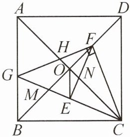 13. (2022·高新)如图,在正方形$ABCD$中,对角线$AC$,$BD相交于点O$,$F是线段OD$上的动点(点$F不与点O$,$D$重合),连接$CF$,过点$F作FG \perp CF分别交AC$,$AB于点H$,$G$,连接$CG交BD于点M$,作$OE // CD交CG于点E$,$EF交AC于点N$。有下列结论:①当$BG = BM$时,$AG = \sqrt{2}BG$;②$\frac{OH}{OM} = \frac{OF}{OC}$;③当$GM = HF$时,$CF^{2} = $ $CN \cdot BC$;④$CN^{2} = BM^{2} + DF^{2}$。其中正确的结论是____。(填序号)