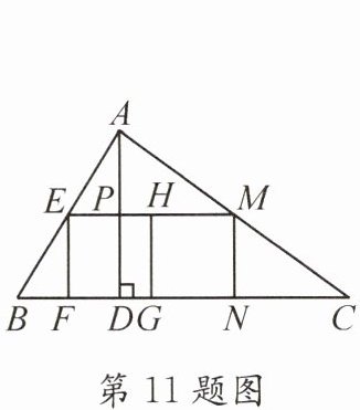 11. (2022·双流)如图,在$\triangle ABC$中,$AD \perp BC$,垂足为$D$,$AD = 5$,$BC = 10$,四边形$EFGH和四边形HGNM$均为正方形,且点$E$,$F$,$G$,$N$,$M都在\triangle ABC$的边上,那么$\triangle AEM与四边形BCME$的面积比为____。