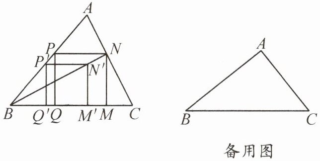 15. (2025·编写)如图,在$\triangle ABC$中,$P'是边AB$上一点,四边形$P'Q'M'N'$是正方形,点$Q'$,$M'在边BC$上,点$N'在\triangle ABC$内。连接$BN'$,并延长交$AC于点N$,过点$N作NM\perp BC于点M$,$NP\perp MN交AB于点P$,$PQ\perp BC于点Q$。