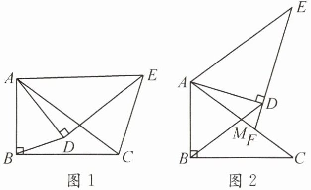 (2)如图$2$,在纸片$ADE绕点A$旋转过程中,当点$D恰好落在\triangle ABC的中线BM$的延长线上时,延长$ED交AC于点F$,求$CF$的长。