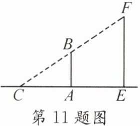 11. (2025·编写)如图,一根直立于水平地面的木杆AB在灯光下形成影子AC(AC>AB),当木杆绕点A按逆时针方向旋转,直至到达地面时,影子的长度发生变化.已知AE= 5m,在旋转过程中,影长的最大值为5m,最小值为3m,且影长最大时,木杆与光线垂直,则路灯EF的高度为______m.