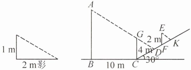 15. (2025·编写)小明想测量电线杆AB的高度,他发现电线杆AB的影子正好落在坡面CD和地面BC上,已知CD和地面成30°角,CD= 4m,BC= 10m,且此时测得1m高的标杆在地面上的影长为2m。