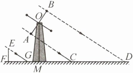 13. (2023·成华)如图是某风车的示意图,其大小相同的四个叶片均匀分布,点M在旋转中心O的正下方。某一时刻,太阳光恰好垂直照射叶片OA,OB,叶片影子为线段CD,测得MC= 8.5米,CD= 13米,此时垂直于地面的标杆EF与它的影子FG的比为2:3(其中点M,C,D,F,G在水平地面上),则OM的高度为____米,叶片OA的长为____米。