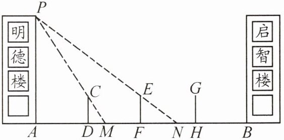 14. (2025·锦江)如图,在某学校的明德楼和启智楼之间有一条文化长廊AB,文化长廊上伫立着三座名人塑像CD,EF,GH,点A,D,F,H,B在同一直线上,且AD= DF= FH= HB.在明德楼的楼顶有一照明灯P,塑像CD的影子为DM,塑像EF的影子为FN.该校“探数学”兴趣小组的同学测得文化长廊AB= 24米,塑像高CD= EF= GH= 3米,塑像CD的影长DM= 2米.