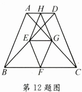 12. 如图,已知四边形 $ABCD$,$AD$ 与 $BC$ 不平行,$AB = CD$,$E$,$F$,$G$,$H$ 分别是 $BD$,$BC$,$AC$,$AD$ 的中点,有下列结论:①$EG \perp HF$;②$HF$ 平分 $\angle EHG$;③$EG = \frac{1}{2}(BC - AD)$.其中正确结论的序号是____.