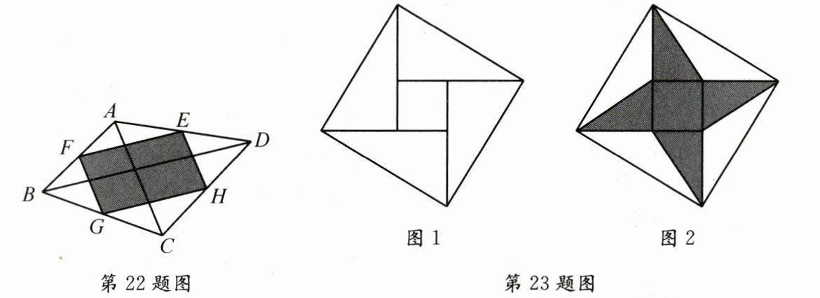 23. 如图,四个全等的直角三角形围成一个大正方形,中间是个小正方形,这个图形是我国汉代数学家赵爽在注解《周髀算经》时给出的,人们称它为“赵爽弦图”. 现分别连接大、小正方形的四组顶点得到图 2 所示的“风车”图案(阴影部分). 若图 1 中的四个直角三角形的较长直角边为 9,较短直角边为 5,现随机向图 2 大正方形内掷一枚小针,则针尖落在阴影区域的概率为 ______.