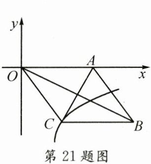 21. 如图,在平面直角坐标系中,点$A的坐标是(5,0)$,函数$y= \frac{k}{x}(x\gt0)的图象经过菱形OABC的顶点C$.若$OB\cdot AC= 40$,则$k$的值为______.