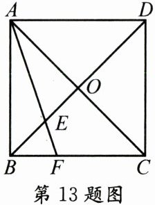 13. 如图,在正方形ABCD中,对角线AC,BD相交于点O,E是OB的中点,连接AE并延长交BC于点F.若$△BEF$的面积为1,则正方形ABCD的面积为______.