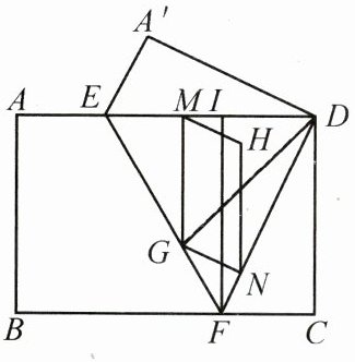 24. (8 分)如图,在矩形 $ABCD$ 中,点 $E$,$F$ 分别在边 $AD$,$BC$ 上,将矩形 $ABCD$ 沿直线 $EF$ 折叠,使点 $B$ 恰好与点 $D$ 重合,点 $A$ 落在点 $A'$ 处,$G$ 为线段 $EF$ 上一动点,过点 $G$ 作 $GM \perp AD$,$GN \perp FD$,垂足分别为 $M$,$N$,以 $GM$,$GN$ 为邻边构造平行四边形 $GMHN$,连接 $DG$,作 $FI \perp AD$ 于点 $I$.若平行四边形 $GMHN$ 的周长为 $4\sqrt{10}$,$AE = 3$,求 $EF$ 的长.