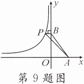 9. 如图,点P在反比例函数 $ y = \frac { k } { x } ( x < 0 ) $ 的图象上, $ P B \perp y $ 轴,点A在x轴上, $ \triangle P A B $ 的面积是2,则k的值是()