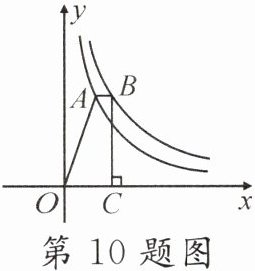 10. (湘西州中考)如图,点A在函数 $ y = \frac { 2 } { x } ( x > 0 ) $ 的图象上,点B在函数 $ y = \frac { 3 } { x } ( x > 0 ) $ 的图象上,且 $ A B // x $ 轴, $ B C \perp x $ 轴于点C,则四边形ABCO的面积为()
