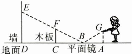 24. (8分)如图,小红同学正在使用手电筒进行物理光学实验,地面上从左往右依次是墙、木板和平面镜.手电筒的灯泡在点$G$处,手电筒的光从平面镜上点$B$处反射后,恰好经过木板的边缘点$F$,落在墙上的点$E$处,测得点$E$到地面的高度$DE = 3.5m$,点$F$到地面的高度$CF = 1.5m$,灯泡到木板的水平距离$AC = 5.4m$,墙到木板的水平距离为$CD = 4m$.已知光在镜面反射中的入射角等于反射角,图中点$A$,$B$,$C$,$D$在同一水平面上.