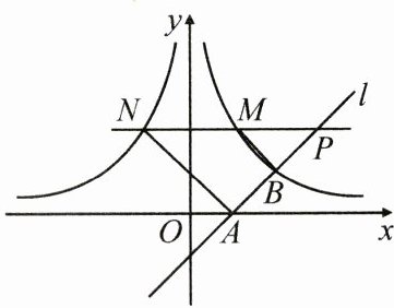 25. (10 分)如图,经过点 $ A(1,0) $ 的直线 $ l $ 与双曲线 $ y=\frac{m}{x}(x>0) $ 交于点 $ B(2,1) $,直线 $ y = 2 $ 分别交双曲线 $ y=\frac{m}{x}(x>0) $ 和 $ y=-\frac{m}{x}(x<0) $ 于点 $ M,N $,交直线 $ l $ 于点 $ P(p,p - 1)(p>1) $,连接 $ BM,AN $。