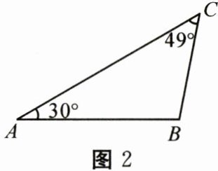 21. (8分)浮式起重机是海上打捞、海上救援和海上装卸的重要设备(如图1),某公司的浮式起重机需更换悬索,该公司设计了一个如图2所示的数学模型,测量知$\angle A = 30^{\circ}$,$\angle C = 49^{\circ}$,$AB = 60m$.请你利用以上数据,求出悬索$AC$和支架$BC$的长.(结果精确到1m,参考数据:$\sqrt{3}\approx 1.73$,$\sin 49^{\circ}\approx 0.75$,$\cos 49^{\circ}\approx 0.66$,$\tan 49^{\circ}\approx 1.15$)
