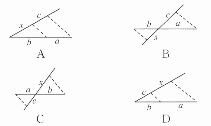 9. 已知线段 $ a $,$ b $,$ c $,求作线段 $ x $,使 $ x = \frac { a c } { b } $,下列作法中正确的是()