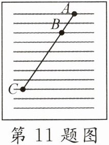 11. 如图,练习本中的横格线都平行,且相邻两条横格线间的距离都相等,点 $ A $,$ B $,$ C $ 在同一条直线上,且都在横格线上. 若 $ A B = 5 \mathrm { cm } $,则 $ B C $ 的长为______$ \mathrm { cm } $.