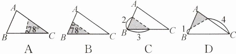 9. (娄底双峰县期中)如图,在$\triangle ABC$中,$\angle A = 78^{\circ}$,$AB = 4$,$AC = 6$. 将$\triangle ABC$沿图示中的虚线剪开,剪下的阴影三角形与原三角形不一定相似的是()